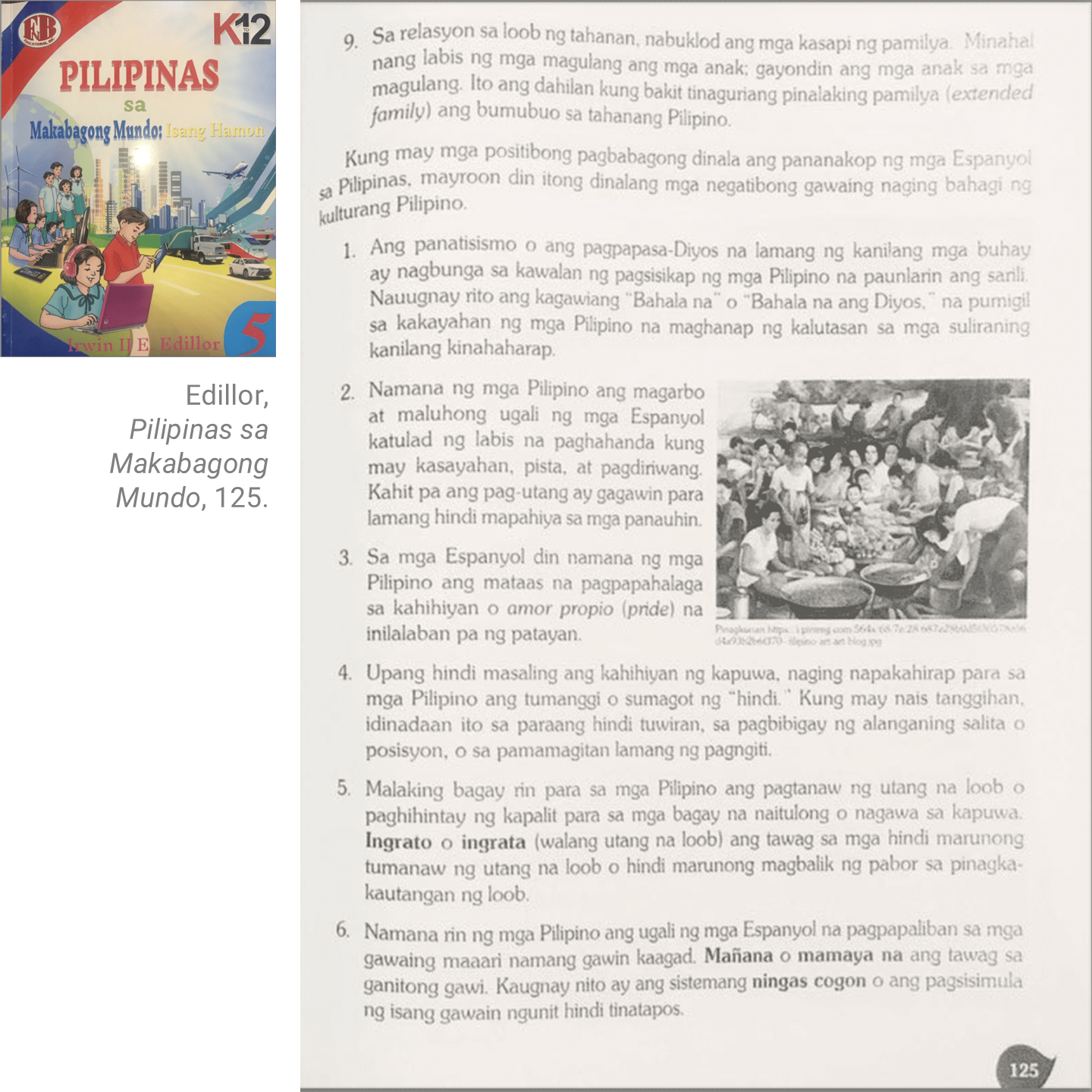 The first consists of statements that attribute Filipino traits to the Spanish, American, and Japanese colonizers. Not only are these claims presented as facts; they also assign historical agency to foreign rulers, denying Filipinos a role in the development of their own culture. In history no change takes place without agency; and historical actors (agents) must be proven, not assumed. One textbook maintains that a whole range of dispositions and practices, from the “bahala na” mentality and the “mañana” habit to pride or amor propio, the inability to refuse a request, and the propensity for a luxurious lifestyle, are all attitudes we acquired from Spain. Another group of textbook authors trace Filipino diligence, creativity, and loyalty to the Japanese.