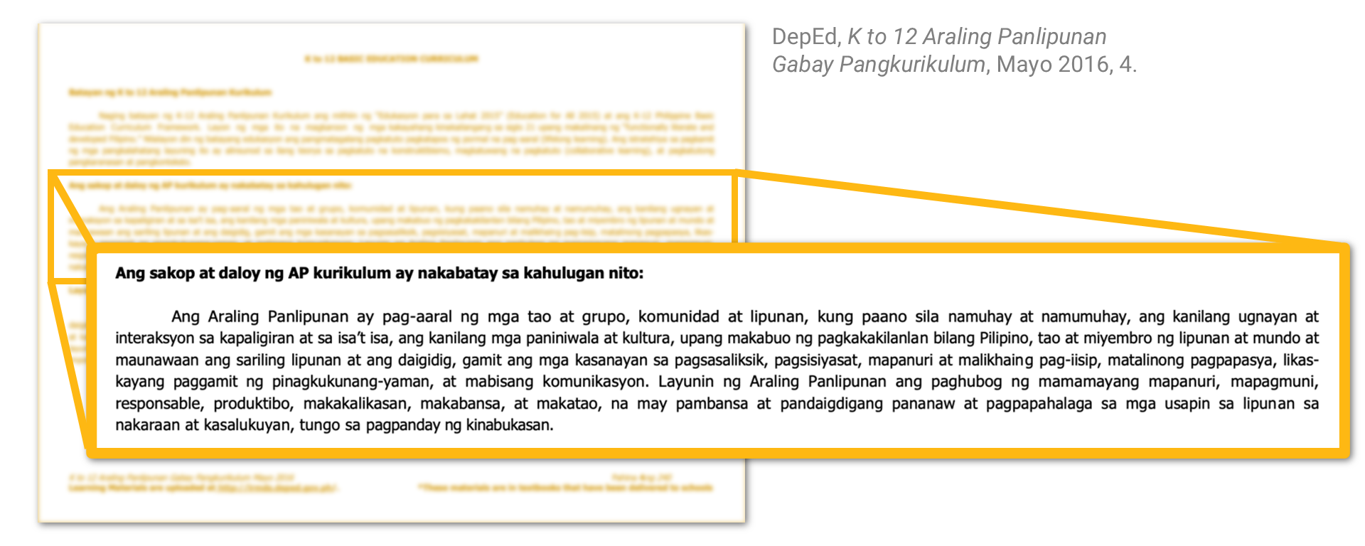 Civic education is a cornerstone of the Araling Panlipunan curriculum, which aims to develop responsible citizens with a clear identity as Filipinos.
